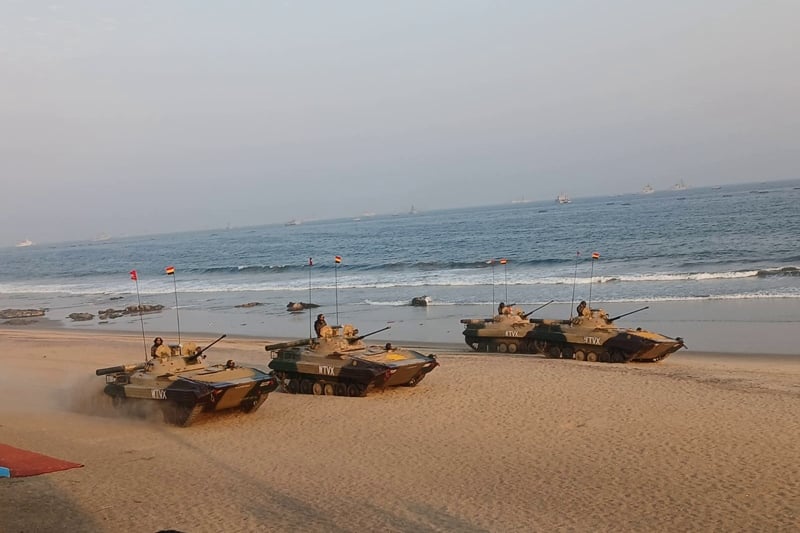 Sobre la arena avanzaron cuatro tanques del ejército indio en una demostración de potencia y capacidad operativa, mientras en el mar una corbeta rápida ejecutó una simulación de persecución y neutralización de un objetivo móvil, culminando con el lanzamiento de un misil que impactó con precisión.
