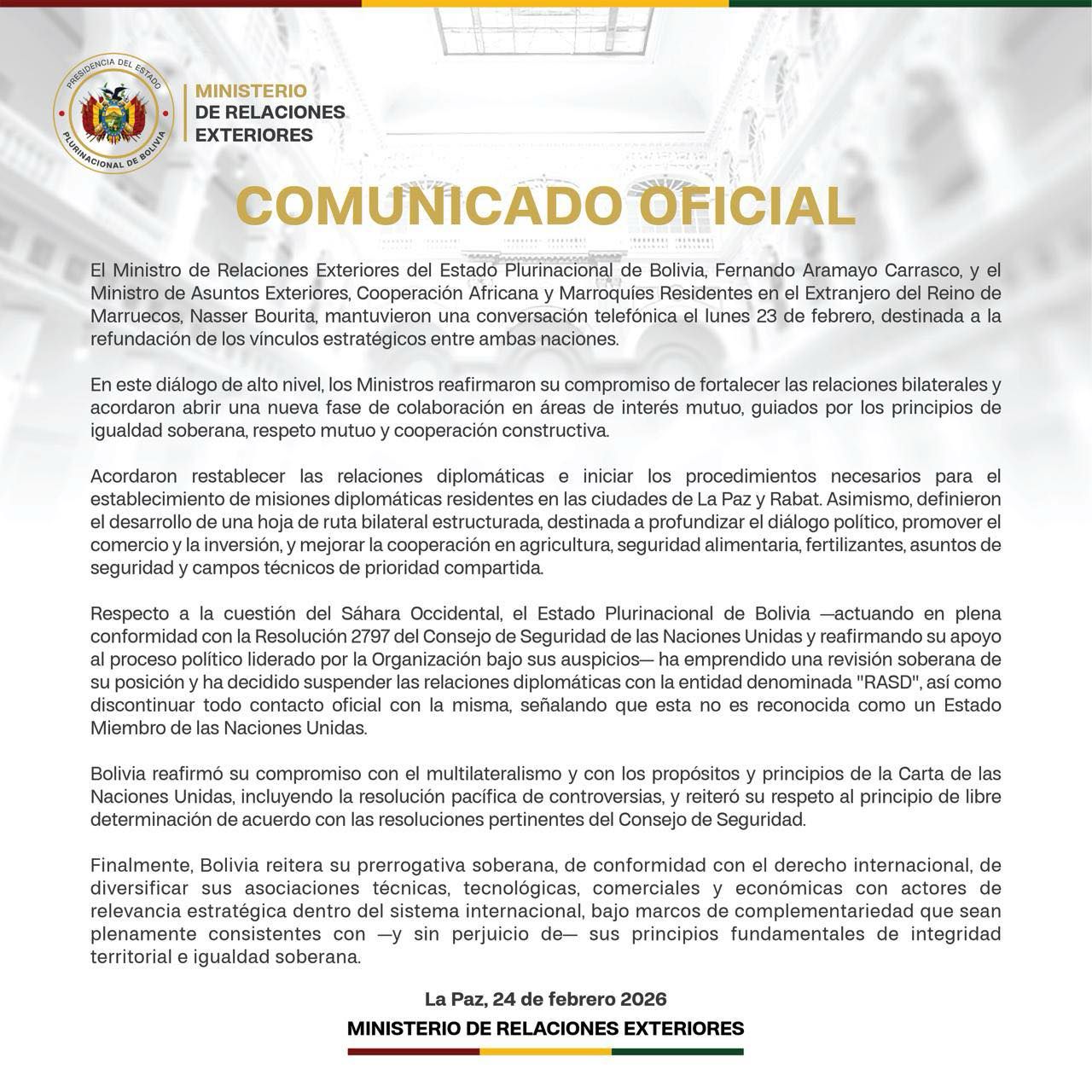 WhatsApp-Image-2026-02-24-at-13.24.35.jpeg El Ministerio de Relaciones Exteriores del Estado Plurinacional de Bolivia informó, mediante un comunicado oficial emitido en La Paz el 24 de febrero de 2026, la reanudación de sus vínculos diplomáticos con el Reino de Marruecos, marcando así el inicio de una nueva etapa en la cooperación bilateral.